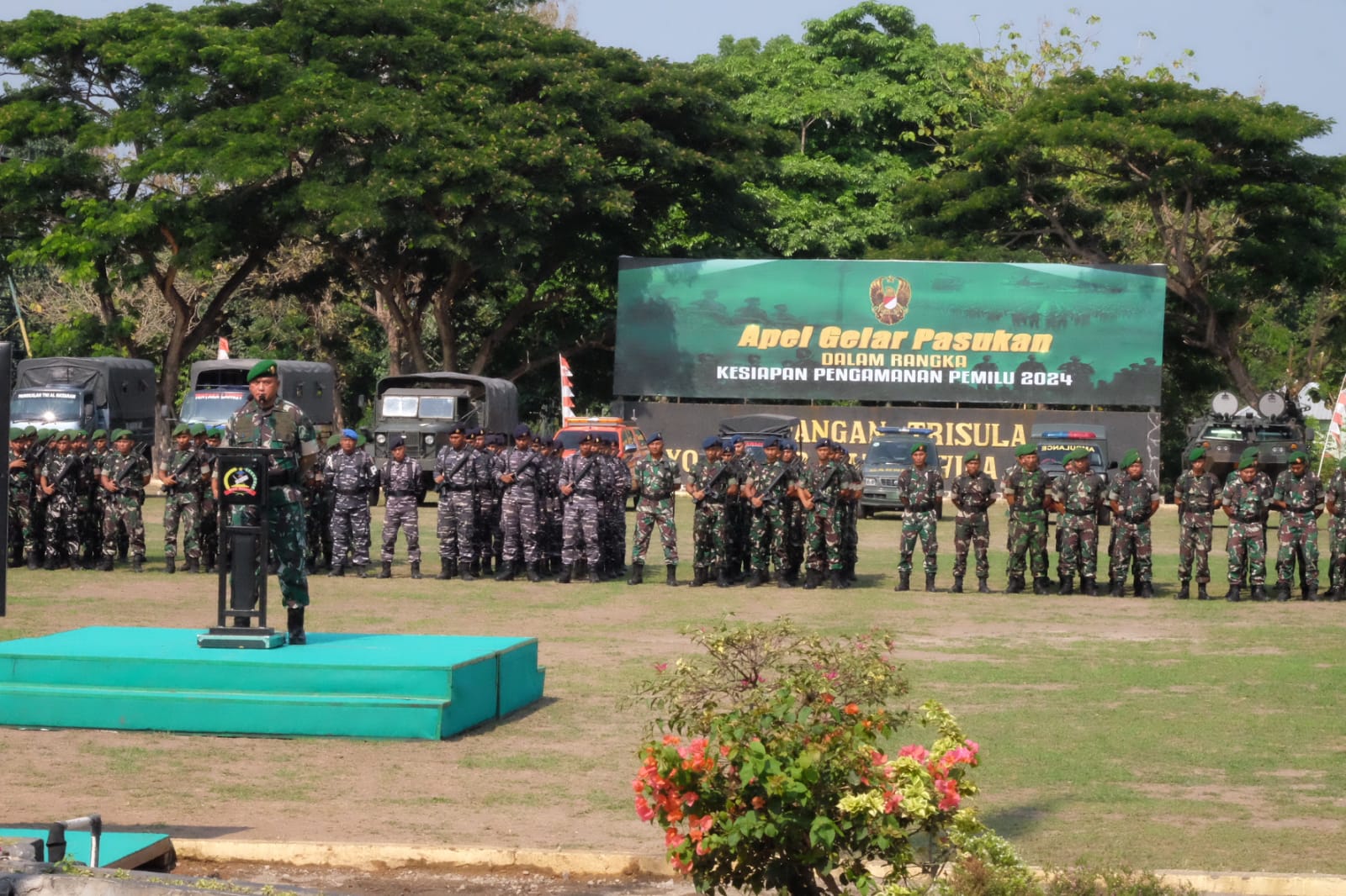 Susunan Pasukan apel gelar pasukan pengamanan Pemilu 2024 di wilayah Korem 162/WB, 1 SST Gabungan PM – TNI, 1 SSK Gabungan Pasukan Bersenjata TNI AD dan TNI AL, 2 SST Gabungan Korem 162/WB dan Balak Aju Kodam IX/Udayana, 2 SST Babinsa Kodim 1606/Mataram, 1 SST Tim Intel Korem 162/WB dan Unit Intel Kodim 1606/Mataram. ( Penrem 162/WB ).