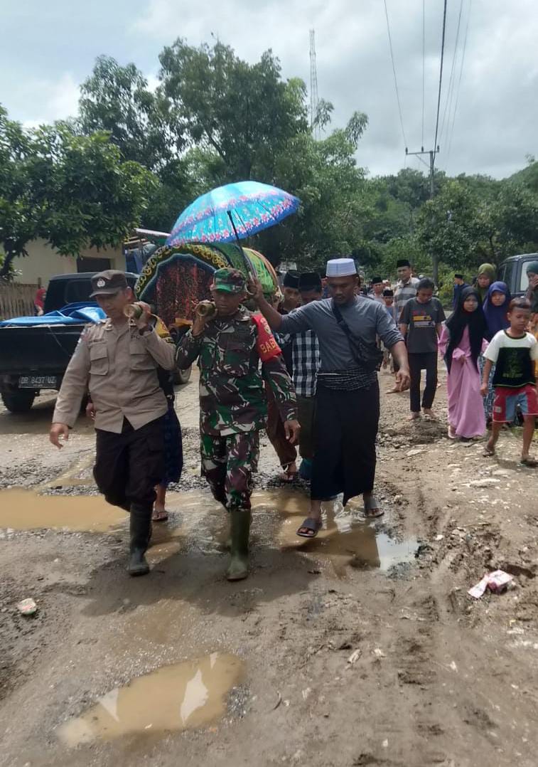 Sekotong Lobar NTB – Sertu Gusti Made Ariawan, Bintara Pembina Desa (Babinsa) Koramil 1606-06/sekotong Kodim 1606/Mataram bantu prosesi pemakaman salah satu warga binaannya yang meninggal dunia karena tanah longsong dan banjir di wilayah kecamatan Sekotong Kabupaten Lombok Barat. akibat curah hujan tinggi Senin (3/1/2023).