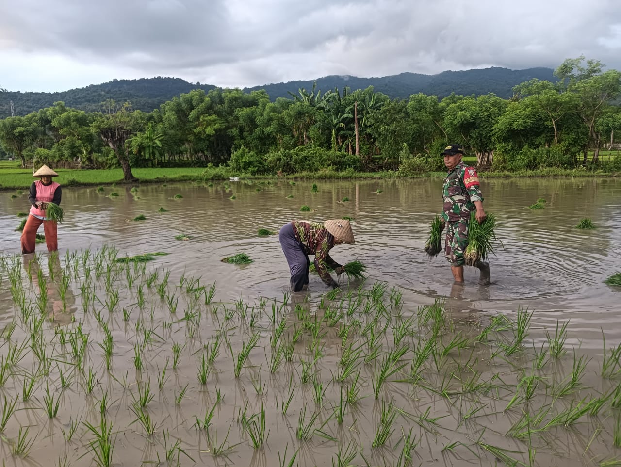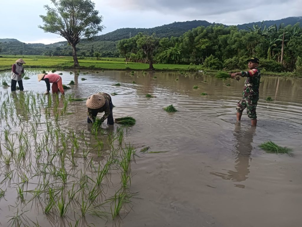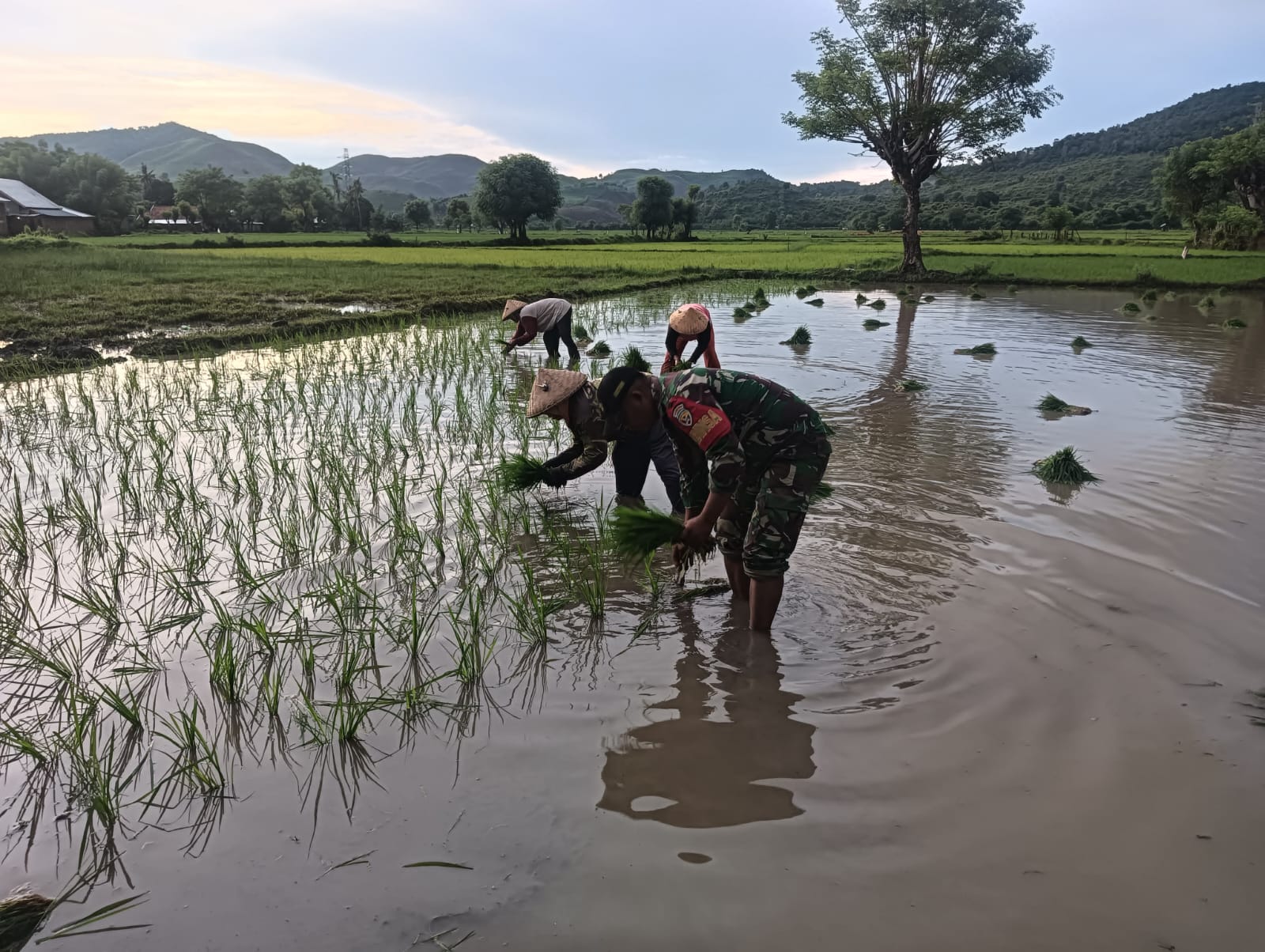 Dompu, NTB – Sinergi antara TNI dan masyarakat kembali membuktikan peran strategisnya dalam mendorong swasembada pangan nasional. Babinsa Kodim 1614/Dompu tidak hanya berperan sebagai penjaga keamanan, tetapi juga sebagai penggerak utama di sektor pertanian. Hal ini terlihat di Desa Kwangko, Kecamatan Manggelewa, Kabupaten Dompu. Babinsa Desa Kwangko, Koptu Arfian Yuliansyah, turun langsung ke sawah membantu petani lokal, Bapak Lukman, menanam padi, Senin (13/01/25)