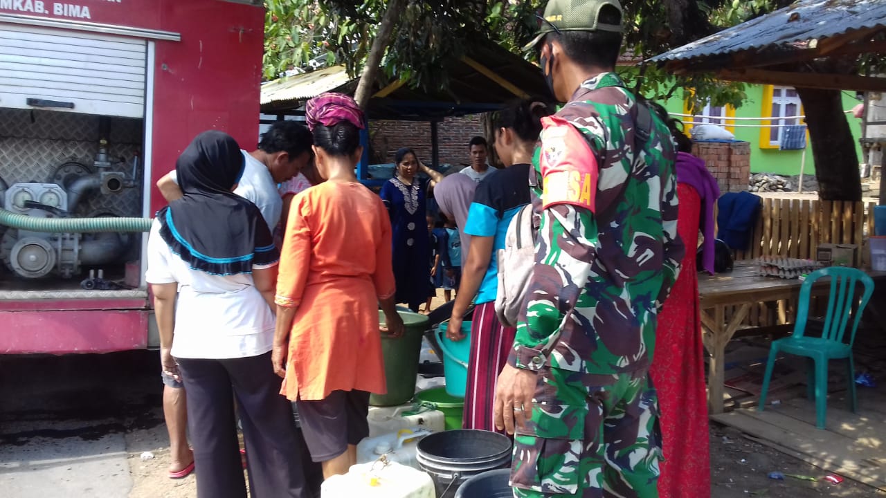 Bima – Babinsa Woro Koramil 02/Bolo Kodim Kodim 1608/Bima, Koptu Heriyanto menyumbang sekaligus mendampingi warga binaan dalam pengedropan air bersih di Dusun Rasabou, Desa Woro, Kecamatan Madapangga, Kabupaten Bima, Jumat (23/10/20).