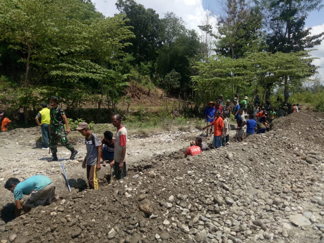 Gotong royong yang dipimpin langsung Dankipur II Kapten Inf Mahfud bersama anggota dan puluhan masyarakat setempat antusias membuat saluran irigasi dengan mengambil air dari aliran sungai di dekat Pos Turiskain.