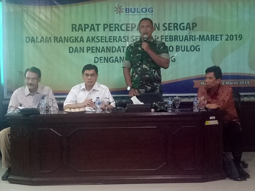 Mataram – Dalam rangka mempercepat penyerapan gabah petani, Bulog menggelar rapat percepatan Sergap dalam rangka Akselerasi Sergap Februari-Maret 2019 dan penandatanganan PO Bulog dengan Mitra Bulog bersama Tim Sergap BKP Kementan yang dihadiri Danrem 162/WB Kolonel Czi Ahmad Rizal Ramdhani, S.Sos. SH. M.Han., Ketua Tim Sergap BKP Kementan Sudirman Maman, Kepala Bulog Divre NTB Ramlan dan instansi terkait di Ruang Rapat Lantai II Kantor Bulog Divre Regional NTB Jln. Langko Kota Mataram, Sabtu (2/3).
