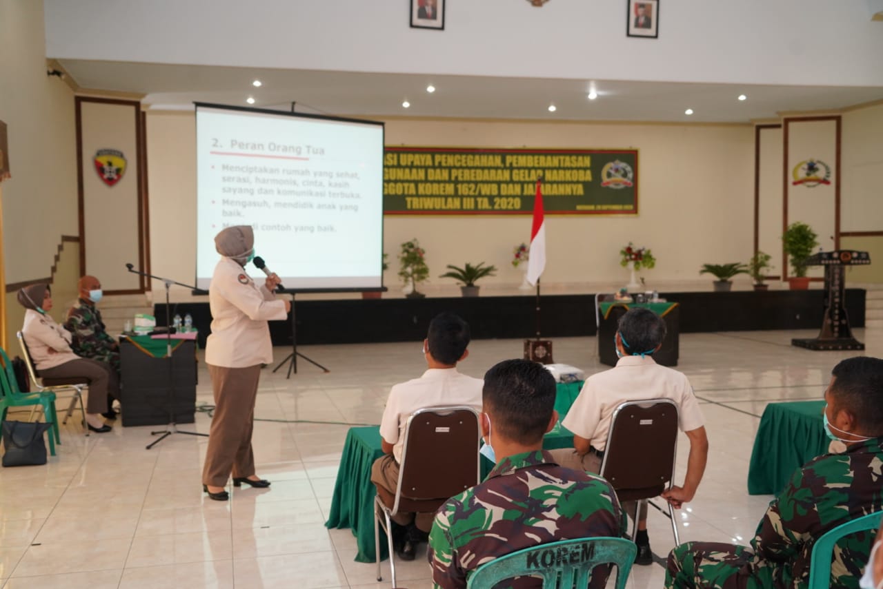 Maka untuk mengantisipasi dan mencegah terjadinya hal tersebut di lingkungan keluarga besar prajurit dan PNS, Korem 162/Wira Bhakti menggelar acara sosialisasi tentang Upaya Pencegahan, Pemberantasan Penyalahgunaan dan Peredaran Gelap Narkoba (P4GN) kepada para pajurit dan PNS satuan jajaran Korem 162/WB, bertempat di Aula Sudirman Korem 162/WB Jalan Lingkar Selatan Kota Mataram, Senin (28/9/2020).