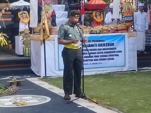 Dandim 1620/Loteng Letkol Czi Prastiwanto, SE. M.I.Pol., memberikan sambutan pada Upacara Pujawali di Pura Prajaniti Gili Lebur Asrama Kodim 1620/Loteng, Minggu (20/1).