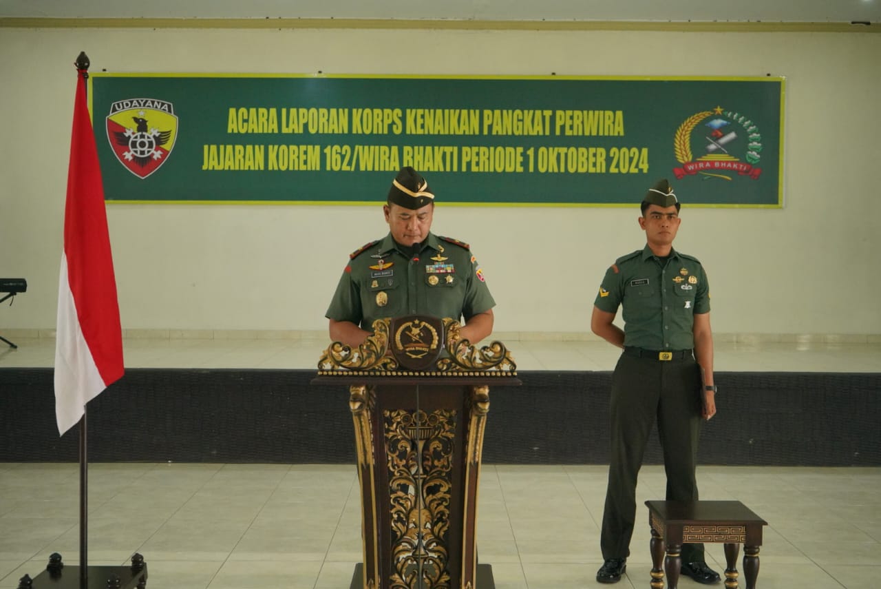 Mataram, NTB – Komandan Korem 162/Wira Bhakti, Brigjen TNI Agus Bhakti, S.I.P., M.I.P., M.Han., memimpin acara Laporan Korps Raport kenaikan pangkat Perwira jajaran Korem 162/WB di Aula Sudirman, Makorem 162/WB Jl. Lingkar Selatan No.162, Pagutan, Kec. Mataram, Kota Mataram, pada Selasa (1/10/2024).