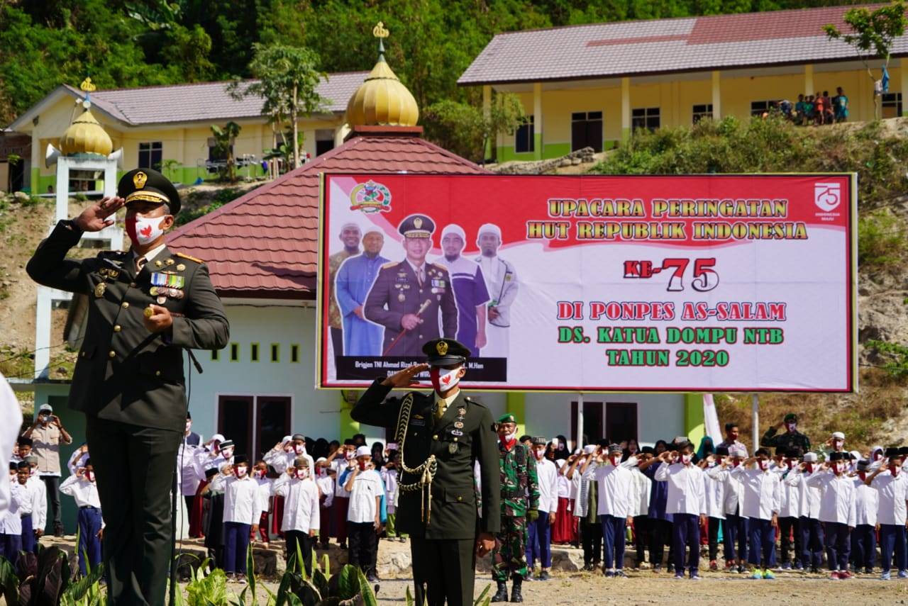 Pada kesempatan itu, Danrem 162/WB menyampaikan ucapan terima kasih kepada pihak Ponpes dan panitia yang telah mempersiapkan pelaksanaan upacara, dirinya mengaku bahagia dan bangga bisa hadir melaksanakan upacara di Ponpes Assalam, karena pelaksanaan upacara HUT Kemerdekaan RI ke-75 di tempat tersebut begitu meriah dan khidmat diikuti oleh para ulama, ustad dan ustadzah serta para santri dari lima Ponpes yang ada di Desa Katua dan Desa O’o.