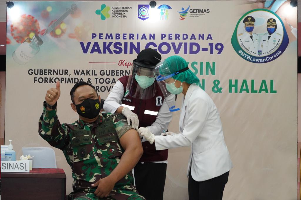 Berkaitan dengan vaksinasi Covid-19, Danrem 162/WB merasa bangga sebagai garda terdepan dalam mendukung dan mensukseskan program pemerintah yakni vaksinasi Covid-19 dengan ikut penyuntikan vaksin Covid-19.