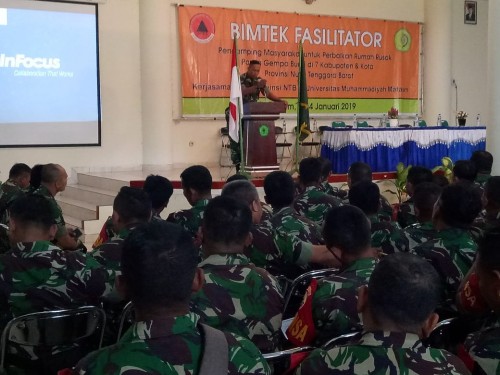 Mataram – Danrem 162/WB Kolonel Czi Ahmad Rizal Ramdhani, S.Sos. SH. M.Han., membuka acara Pembinaan Teknis (Bimtek) Fasilitator penanggulangan pasca gempa dan menyaksikan penandatanganan MOU antara Ka pelaksana BPBD NTB dengan Rektor Universitas Muhammadiyah Mataram Drs. H. Arsyad Abdul Gani, M.Pd., di Kampus Universitas Muhammadiyah Mataram, Kamis (3/1).