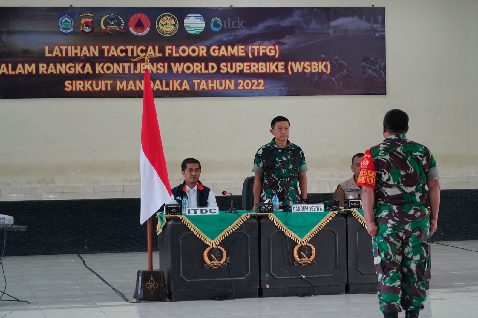 Mataram NTB – Korem 162/WB gelar Latihan Tactical Floor Game (TFG) dalam rangka Kontijensi World Super Bike ( WSBK) sebagai bentuk simulasi persiapan di lapangan, yang diadakan di Aula Sudirman Makorem 162/WB Jl. Lingkar Selatan Kota Mataram. Senin (07/11/22).