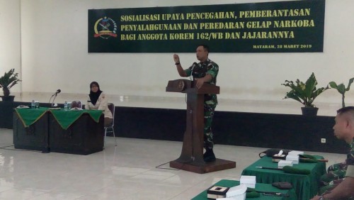 Mataram – Korem 162/WB menggelar sosialisasi upaya pencegahan, pemberatasan, penyalahgunaan dan peredaran gelap Narkoba (P4GN) di Aula Sudirman Makorem 162/WB yang diikuti seluruh personel Korem jajaran se Garnizun Mataram, Kamis (28/3).