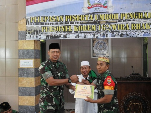 Mataram – Seusai Sholat Dzuhur Berjamaah dan tausyiah yang disampaikan TGH. Taesir Al Azhar, Lc. MA., di Masjid Makorem 162/WB, Danrem 162/WB Kolonel Czi Ahmad Rizal Ramdhani, S.Sos. SH. M.Han., didampingi Dandim 1608/Bima Letkol Inf Bambang Kurnia Eka Putra memberangkatkan seorang Babinsa Kodim 1608/Bima untuk berangkat ibadah umrah atas prestasinya dalam melaksanakan tugas sebagai Babinsa Desa Penato’i Koramil 1608-01/Kota, Rabu (23/1).