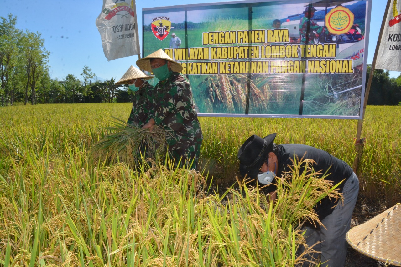 Persediaan Cadangan Pangan ditengah Covid-19 salah satu dampak yang menjadi perhatian seluruh steakholder yang tergabung dalam Gugus Tugas Percepatan Penanganan Penyebaran Covid-19, Danrem 162/WB Kolonel Czi Ahmad Rizal Ramdhani, S.Sos. SH. M.han., bersama Forkopimda Kabupaten Lombok Tengah melaksanakan panen raya bersama di lahan seluas 4 hektar milik Bapak H. Agus Nirmala di Dusun Antik Desa Gapura Kecamatan Pujut Kabupaten Lombok Tengah, Kamis (23/04).