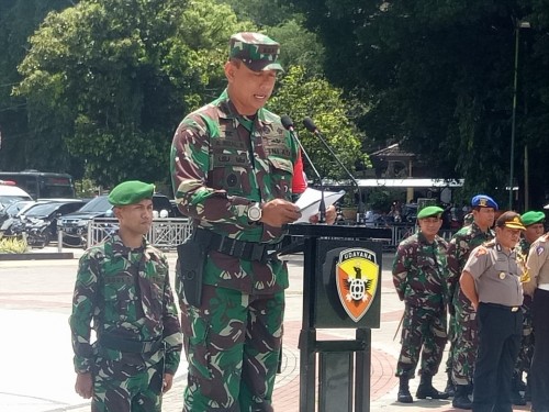 Apel gelar pasukan yang diikuti seluruh Prajurit TNI, Polri dan instansi terkait diambil langsung Danrem 162/WB Kolonel Czi Ahmad Rizal Ramdhani, S.Sos. SH. M.Han., Dansatgas Pam VVIP.