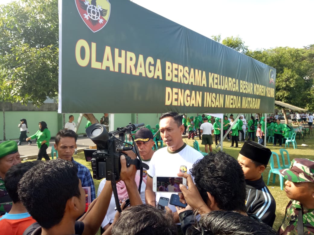 Danrem 162/WB Kolonel Czi Ahmad Rizal Ramdhani, S.Sos., SH., M.Han., usai berolahraga sepak bola bersama rekan media di Makorem 162/WB langsung di wawancara sejumlah media yang ikut bergabung tadi pagi, Jumat (13/7).