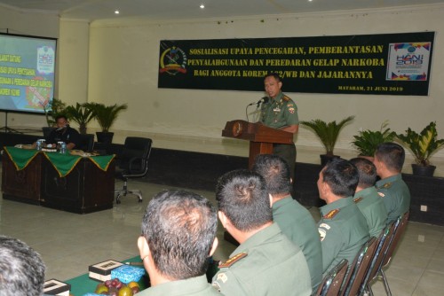 Mataram – Dalam rangka meminimalisir penyalahgunaan narkotika dan oba-obat berbahaya (Narkoba) di lingkungan Prajurit dan PNS, Korem 162/WB tidak tanggung-tanggung menghadirkan Kepala Badan Narkotika Nasional (BNN) Provinsi NTB Brigjen Pol Muhamad Nurochman, S.I.K., untuk memberikan penyuluhan tentang bahaya Narkoba kepada seluruh personel Korem, Kodim 1606/Lobar, Disjan dan Yonif 742/SWY di aula Sudirman Makorem jalan Lingkar Selatan Nomor 162 Mataram, Jumat (21/6).
