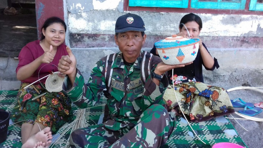 Disela-sela kesibukannya dalam kegiatan TMMD ke 102 tahun 2018 di wilayah Kabupaten Lombok Timur, Komandan Sasaran (Dansas) 6 di Dusun Embung Dalem Desa Sukadamai Pelda Lalu Muhammad Badri mendatangi rumah Inaq Galih yang kesehariannya membuat kerajinan tangan dari daun lontar, Senin (16/7).