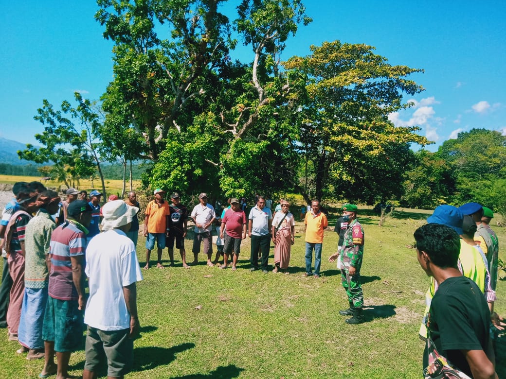 Belu NTT – Sebagai wujud kepedulian terhadap keselamatan masyarakat di wilayah perbatasan Republik Indonesia – Republik Demokratik Timor Leste, personel Pos Turiscain kipur II Satgas Pamtas Sektor Timur bersama dengan anggota Polsek Haikesak dan Pos Brimob menggelar sosialisasi tentang patok batas kedua negara kepada masyarakat Turiscain Desa Maumutin Kecamatan Raihat Kabupaten Belu Nusa Tenggara Timur, Sabtu (1/5/2021).