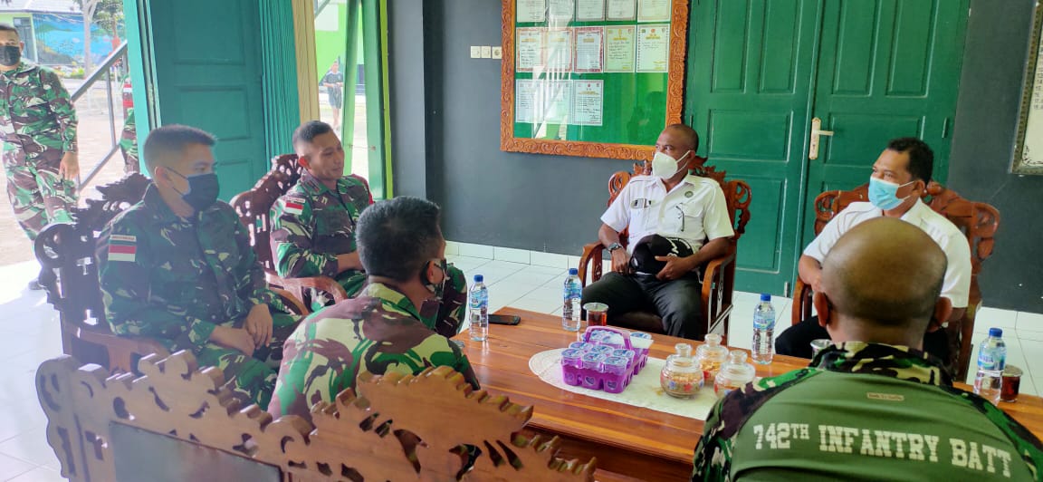 Belu NTT – Komandan Satgas Pamtas RI-RDTL Yonif 742/SWY Mayor Inf Bayu Sigit Dwi Untoro didampingi Wadan Satgas Mayor Inf Aditya Nugraha dan staf menyambut hangat kunjungan kerja Kepala BNNK Belu bersama rombongan di ruang tamu Mako Satgas Pamtas RI-RDTL Sektor Timur Kelurahan Umanen Kecamatan Atambua Barat Kabupaten Belu Nusa Tenggara Timur, Selasa (30/3/2021).