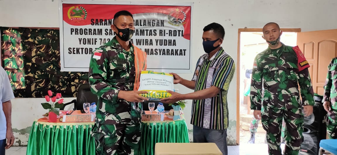 Usai memberikan sambutan, acara dilanjutkan dengan penyerahan bantuan tali asih berupa pakaian layak pakai, sarana olahraga dan Alkitab yang diserahkan Dansatgas kepada tokoh masyarakat, tokoh agama dan tokoh pemuda Desa Dafala.
