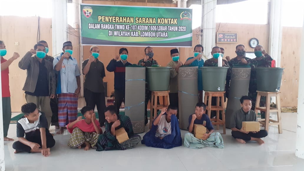 LOMBOK UTARA – Komandan Kodim 1606/Lobar Kolonel Czi Efrijon Kroll, S.IP., M.M. selaku Komandan Satgas TNI Manunggal Membangun Desa (TMMD) ke 107 tahun 2020 Kodim 1606/Lobar menyerahkan bantuan di Masjid Nurul Bashar Dusun Busur Barat Desa Rempek Kecamatan Gangga Kabupaten Lombok Utara NTB, Sabtu (11/4).