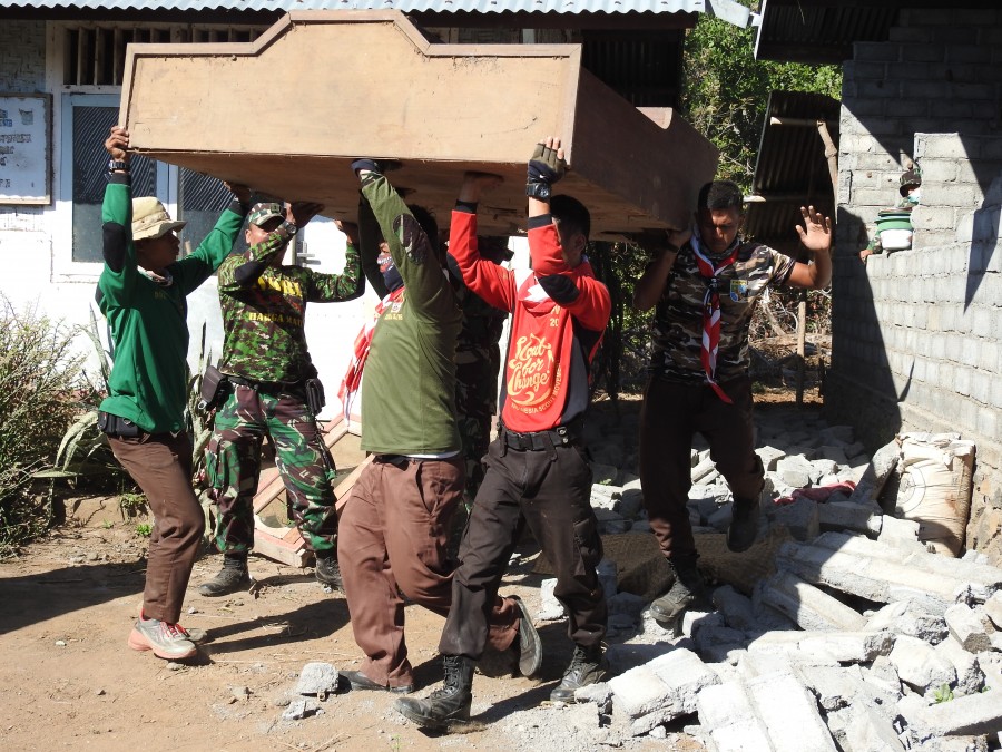 Selong – Ratusan personel TNI dari gabungan Korem 162/WB bersama Kodim 1615/Lotim, Yonif 742/SWY dan Pramuka Saka Wira Kartika binaan Korem melanjutkan karya bhakti membersihkan puing-puing akibat gempa di Kecamatan Sembalun maupun Kecamatan Sambelia Kabupaten Lombok Timur, NTB, Kamis (2/8).