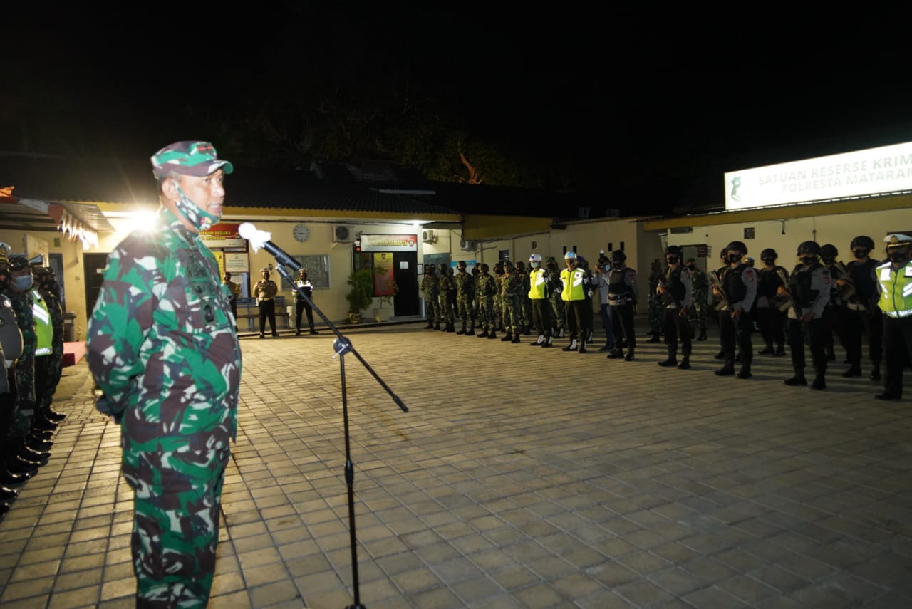 Mataram – TNI-Polri bersama Satpol PP dan Dishub menggelar apel gabungan dipimpin Danrem 162/WB Brigjen TNI Ahmad Rizal Ramdhani, S.sos. SH. M.Han, dalam rangka patroli gabungan pendisiplinan masyarakat guna memutus rantai penyebaran Covid-19, bertempat di Lapangan Apel Polres Kota Mataram, Jalan Langko Kota Mataram, Sabtu (29/8/2020) pukul 21.10 Wita.