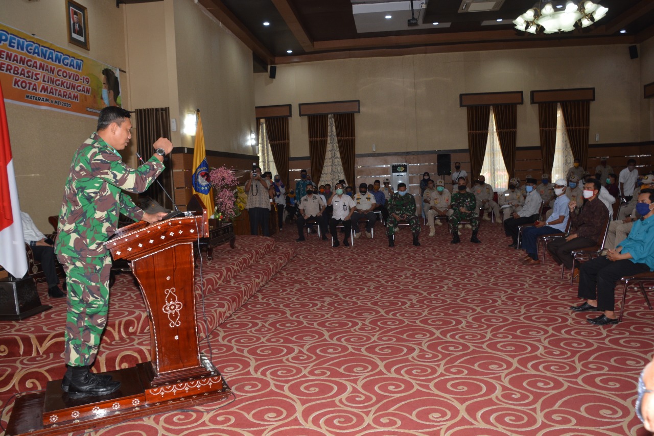 Mataram – Usai peresmian Role Model Pasar Tradisional sesuai SOP Covid-19 bersama Forkopimda Prov NTB di Pasar Mandalika Mataram, Danrem 162/WB kembali menghadiri kegiatan Pencanangan Penanganan Covid-19 Berbasis Lingkungan (PC19BL) sebagai upaya menekan dan memutus penyebaran Covid-19 di wilayah kota Mataram bertempat di aula Pendopo Walikota Mataram, Kota Mataram, Rabu (6/5).