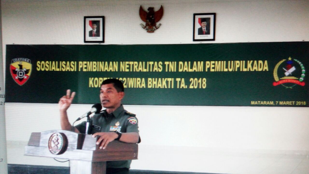 Netralitas TNI pada pemilihan kepala daerah (Pilkada) serentah tahun 2018 dan Pemilu maupun pemilihan Presiden dan Wakil Presiden (Pilpres) tahun 2019 mendatang adalah harga mati. Hal ini sering disampaikan oleh pimpinan TNI mulai dari tingkat pusat hingga daerah pada setiap waktu dan kesempatan. Hari ini Selasa (7/3) Korem 162/WB kembali lagi menggelar sosialisasi tentang menjaga Netralitas TNI pada Pilkada serantak Juni mendatang.