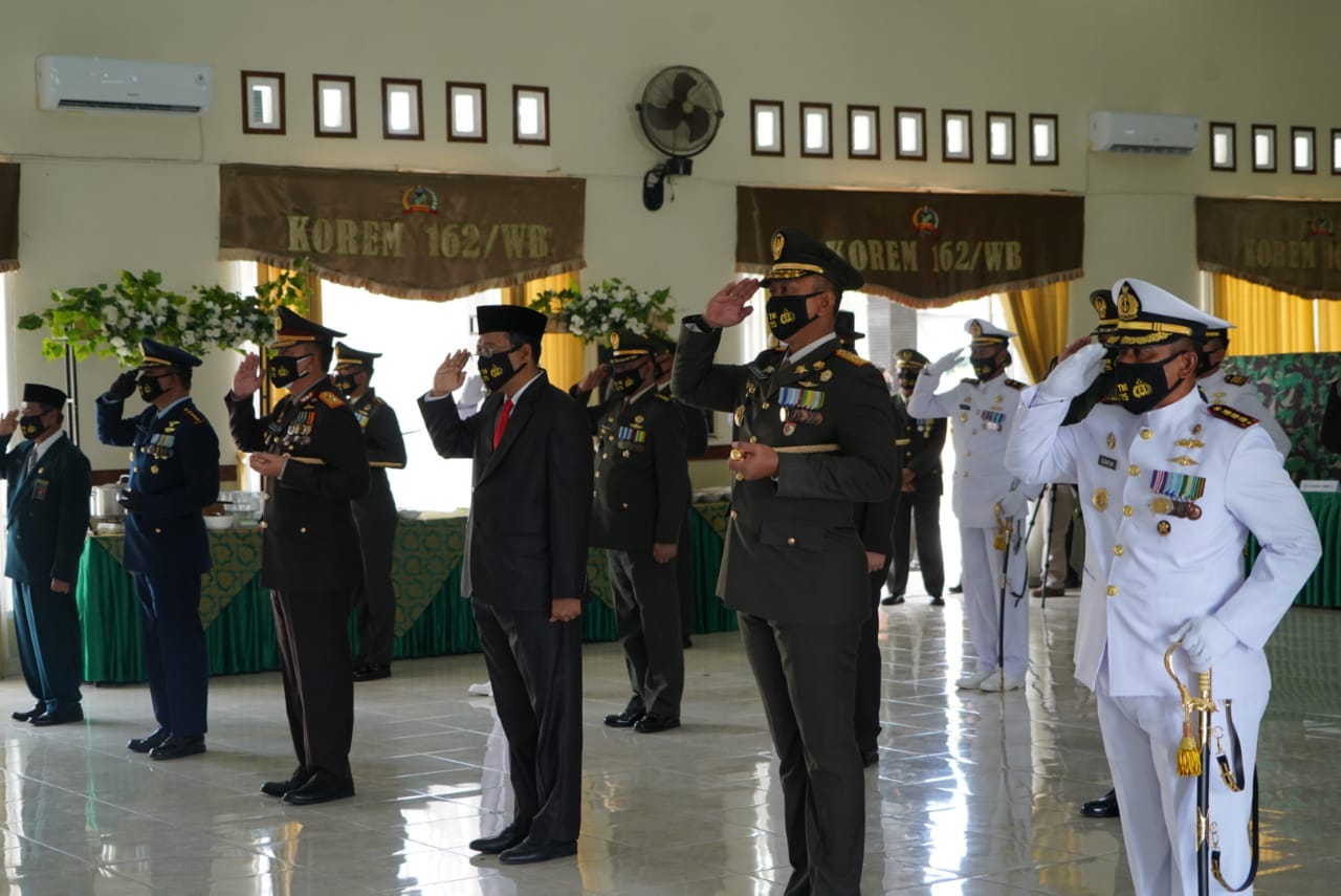 Kegiatan tersebut diikuti secara Virtual oleh Jajaran TNI di Provinsi Nusa Tenggara Barat (NTB) yang dihadiri oleh Gubernur NTB Dr. H. Zulkieflimansyah, Kapolda NTB Irjen Pol M. Iqbal, SIK. MH., Danrem 162/WB Brigjen TNI Ahmad Rizal Ramdhani, S.Sos. SH. M.Han., Kasrem 162/WB Kolonel Arm I Made Kariawan, Irwasda Polda NTB Kombes Pol Djoko Hari Utomo, Danlanal Mataram Kolonel Laut (P) Suratun, SH., Danlanud ZAM Kolonel Pnb Andri Gandhy, Para Kasi Korem 162/WB, para PJU Polda NTB, para Dandim jajaran Korem 162/WB, Kapolresta Mataram, Kapolres Lobar, Danyonif 742/SWY, Dan/Ka/Pa Satdisjan jajaran Korem 162/WB, jajaran Lanal Mataram, Lanud ZAM Rembiga, serta unsur Forkopimda lainnya, dilanjutkan dengan acara syukuran di Aula Sudirman Makorem 162/WB Jalan Lingkar Selatan Kota Mataram, Senin (5/10/2020).