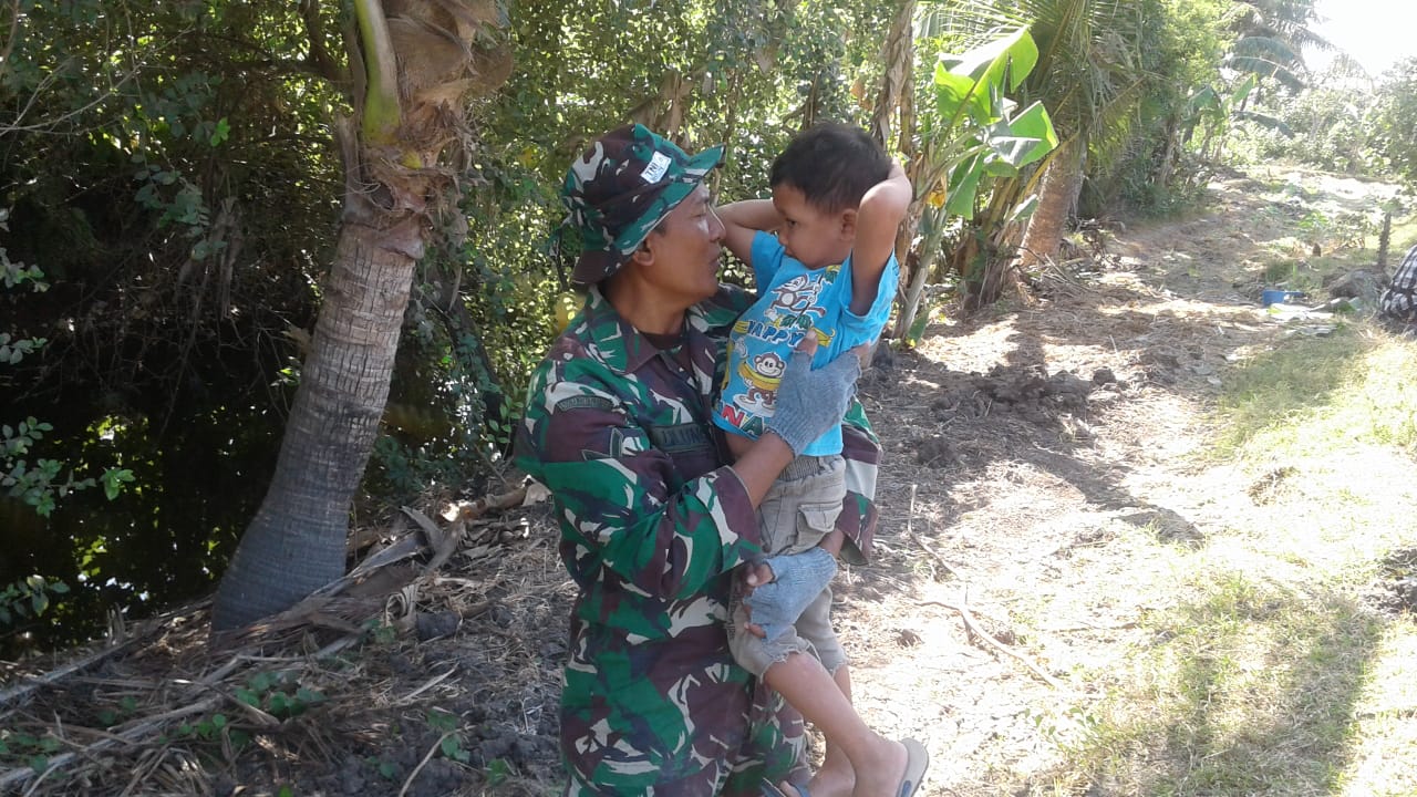 Seperti yang dilakukan Pratu Taofik di Dusun Eat Longkak Desa Sukaraja Kecamatan Jerowaru Lombok Timur, NTB pagi tadi sebelum memulai kegiatan fisik. Ia mengajak anak Saudara Muhammad untuk bermain dan menggendongnya.