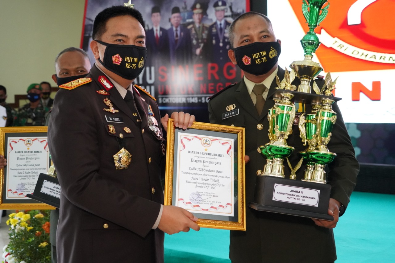 Kegiatan HUT ke-75 TNI diikuti oleh PJ Korem 162/Wira Bhakti dan para Dandim serta PJU Polda NTB dan Kapolres yang menerima piagam penghargaan.