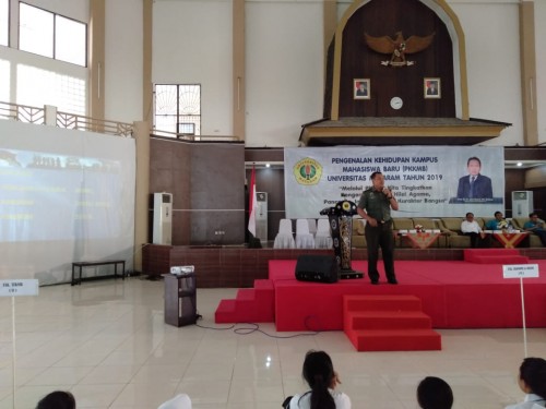 Mataram – Kepala Seksi Teritorial Korem 162/WB Letnan Kolonel Arh Budiono memberikan materi pembekalan ketahanan nasional dan bela negara kepada Mahasiswa baru Universitas Mataram di Gedung Auditorium Abu Bakar Unram Mataram, Rabu (10/9).