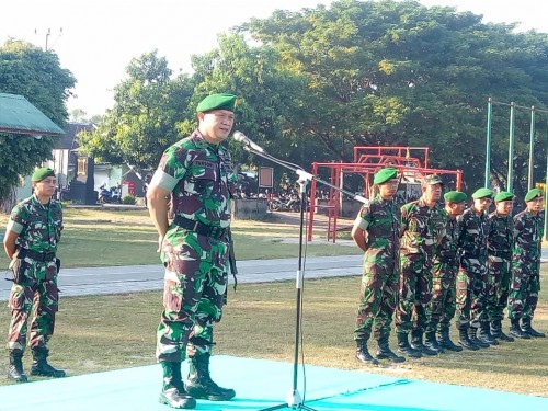 Mataram – Kasrem 162/WB Letnan Kolonel Inf Endarwan Yansori mengambil apel pengecekan personel Korem 162/WB dan jajaran se Garnizun Mataram baik yang kembali melaksanakan cuti gelombang I maupun yang akan berangkat cuti gelombang II tahun 2019 di lapangan Yonif 742/SWY Gebang Mataram, Jumat (7/6).