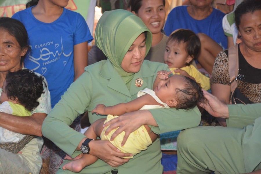 Tanjung – Ketua Dharma Pertiwi Daerah J PD IX/Udayana Ny. Riza Benny Susianto, bersama Ketua Darma Pertiwi Koorcab NTB Daerah J Ny. Kirana Rizal Ramdhani memberikan sumbangan kepada korban bencana gempa Kabupaten Lombok Utara (KLU), Sabtu (11/8).