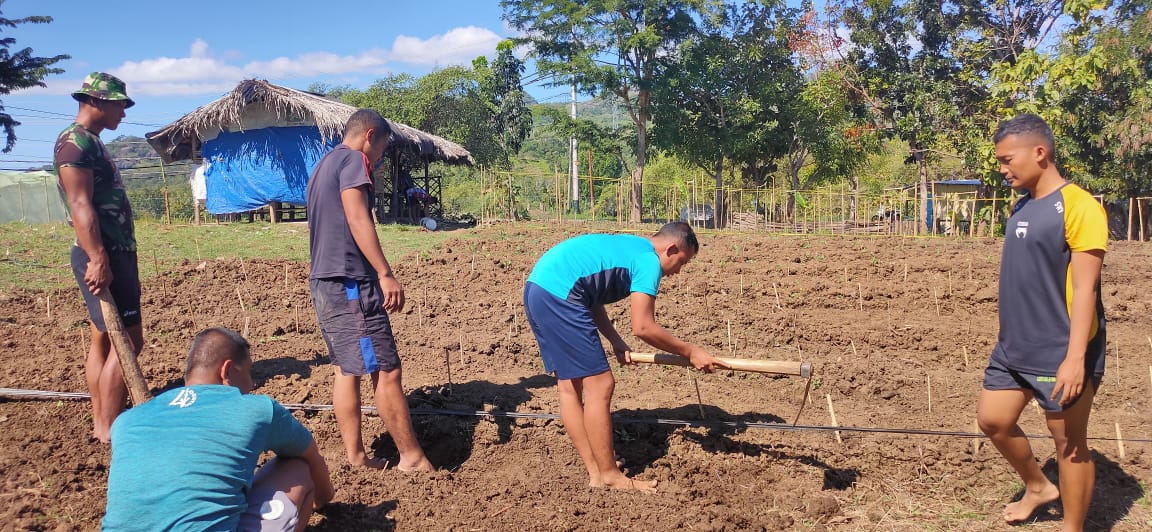 Belu NTT – Dalam rangka menjaga ketahanan pangan di wilayah perbatasan, Pos Dafala Kipur III Satgas Pamtas RI-RDTL Sektor Timur memanfaatkan lahan warga untuk bercocok tanam di Dusun Dubasa A Desa Dafala Kecamatan Tasifeto Timur. Pemanfaatan lahan tersebut merupakan kerjasama pemilik lahan Gaspear Robesin dengan Pos Dafala di atas lahan seluas 1 hektar.