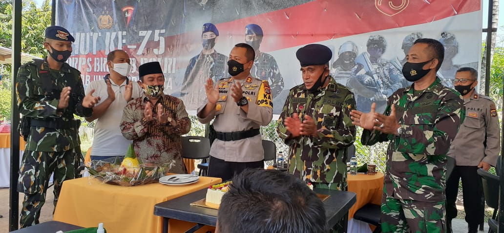 Sumbawa Barat – Kodim 1628/SB dipimpin Kasdim Mayor Inf Dahlan beserta Perwira staf dan Danramil Jajaran Kodim memberikan surprise mengantarkan kue ulang tahun yang bergambarkan logo Korp Brimob di hari ulang tahun Brimob Polri ke 75 ke Markas kompi 2 Brimob Batalyon B di Dusun Bertong B Kelurahan Telaga Bertong Kecamatan Taliwang Sumbawa Barat, Sabtu (14/11/2020).