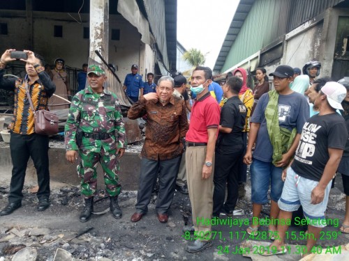 Sumbawa – Sejak dilalap sijago merah pada Rabu sore (23/01/2019), sebanyak 50 toko di Pasar Seketeng Kelurahan Seketeng Kecamatan Sumbawa ludes terbakar. Hari ini, Sabtu (26/1) sekitar 30 orang anggota Kodim 1607/Sumbawa dipimpin Danramil 1607-01/Sumbawa Kapten Inf Tamtanus melaksanakan pengamanan dan membantu perpindahan para pedagang dari Pasar Seketeng ke lokasi Pasar sementara yakni Stadion Pragas.