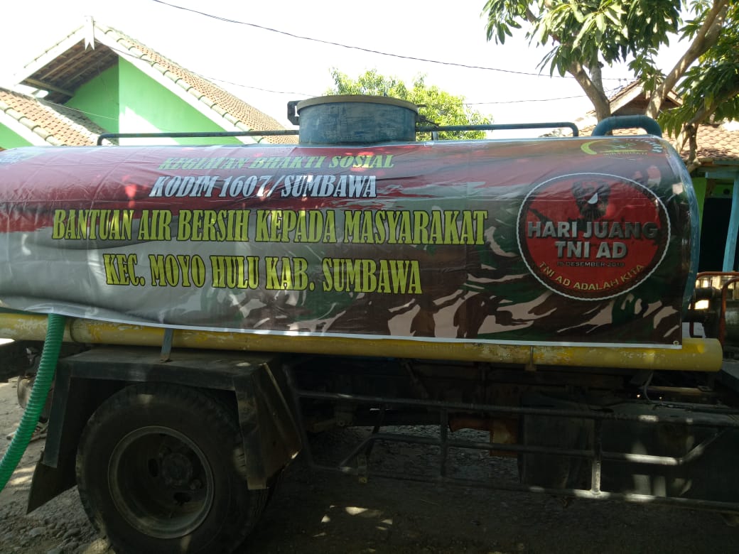 Sumbawa – Kebutuhan air bersih hingga saat ini masih terjadi dibeberapa wilayah seperti di Desa Semamung Kecamatan Moyo Hulu Kabupaten Sumbawa. Kodim 1607/Sumbawa bersama jajaran bekerjasama dengan Pegadean dan PUPR Sumbawa mendistribusikan air bersih untuk warga Desa Semamung dengan mengirim lima mobil tangki air berkapasitas 4000 liter.
