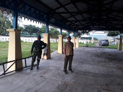 Dompu – Dan SSK TNI Manunggal Membangun Desa (TMMD) ke 104 tahun 2019 Kodim 1614/Dompu Kapten Inf Mujiono bersama beberapa orang anggota Satgas TMMD menyiapkan lokasi rencana tatap muka tim Pengawas dan Evaluasi (Wasev) dari Mabes TNI AD di Lokasi Pasar Desa Lanci Jaya depan lapangan Desa Lanci Jaya Kecamatan Manggelewa, Jumat (15/3).