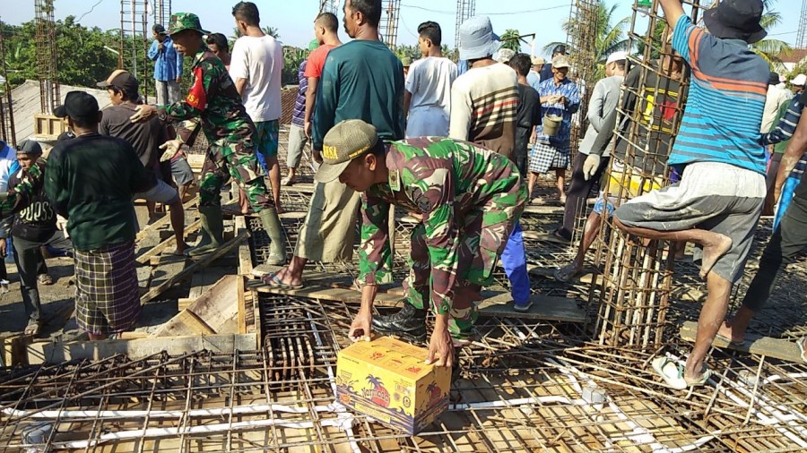 Seperti yang dilakukan hari ini, Minggu (8/4) masyarakat Balekuwu Desa Gunungsari Kecamatan Gunungsari Lombok Barat beramai-ramai bersama anggota Koramil 1606-07/Gunungsari bersatu padu melakukan pengecoran lantai dua pembangunan masjid Baitul ‘Ilmi. Mereka bahu membahu bergotong royong dengan penuh semangat dan keceriaan menyelesaikan pengecoran.