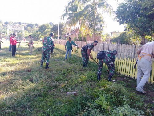 Sumbawa Besar – Koramil 1607-02/Empang bersama masyarakat Desa Banda Kecamatan Tarano Sumbawa Besar melaksanakan gotong-royong pembersihan dan penataan selokan dan areal lapangan Desa Banda, Selasa (18/6).
