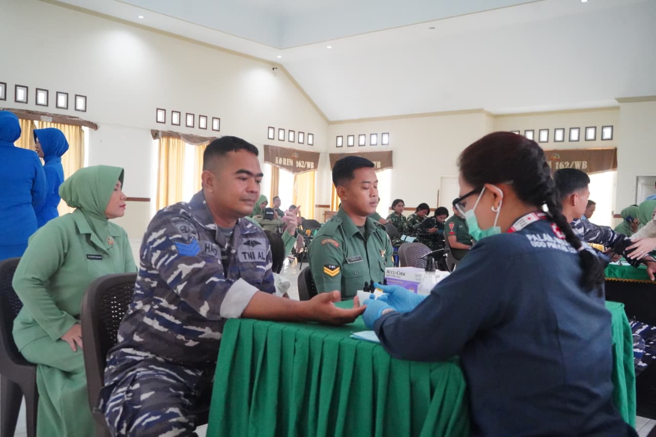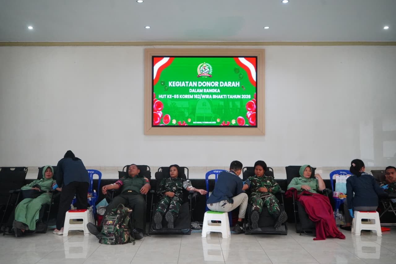 Mataram, NTB — Sebanyak 74 kantong darah berhasil dikumpulkan dalam kegiatan Bakti Sosial Donor Darah yang digelar Korem 162/Wira Bhakti dalam rangka memperingati HUT ke-65 Korem 162/WB dan HUT ke-80 Persit Kartika Chandra Kirana (KCK) Tahun 2026. Kegiatan berlangsung di Aula Sudirman Makorem 162/WB, Jalan Lingkar Selatan No. 162, Pagutan, Kecamatan Mataram, Rabu (11/2/2026).