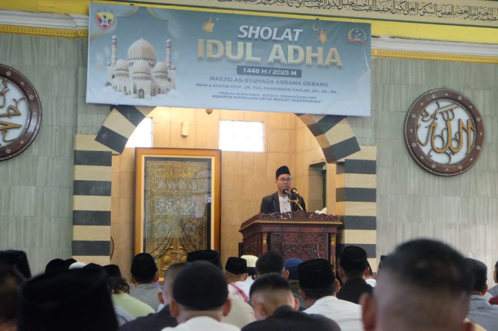 Bertindak sebagai Imam dan Khatib adalah Prof. Dr. TGH. Fahrurrozy Dahlan, QH.SS., M.A. Dalam khutbahnya, beliau menekankan bahwa Idul Adha adalah momen spiritual untuk meneladani keikhlasan Nabi Ibrahim, ketakwaan Nabi Ismail, dan keteguhan Siti Hajar, sebagai contoh pengabdian total kepada Allah SWT dan kemanusiaan.