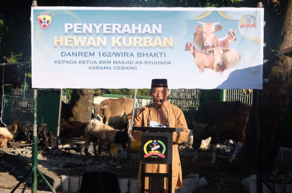 Dalam sambutan yang dibacakan oleh Kasrem, Danrem 162/WB Brigjen TNI Moch. Sjasul Arief, S.Sos. menyampaikan bahwa Idul Adha bukan hanya ritual keagamaan semata, tetapi juga panggilan hati untuk berbagi dan menyatukan empati dengan masyarakat yang membutuhkan.