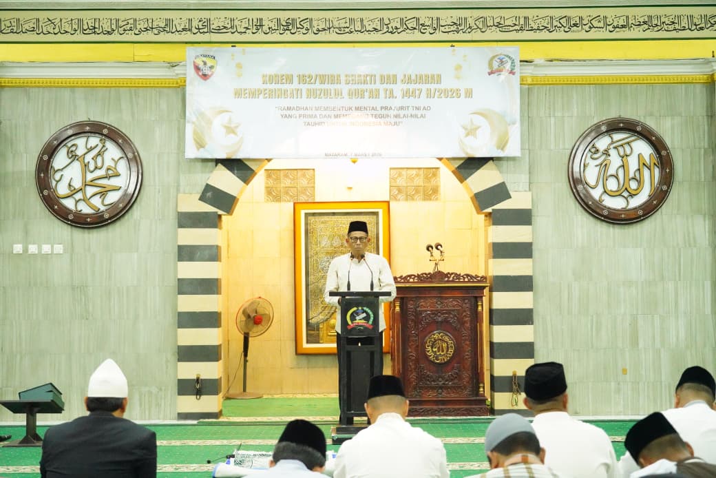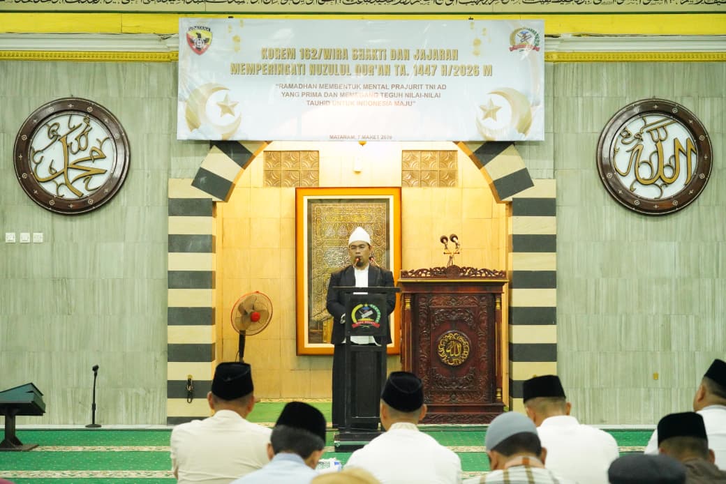 Mataram, NTB – Korem 162/Wira Bhakti memperingati Nuzulul Qur’an 1447 H/2026 M sebagai momentum meningkatkan keimanan dan ketakwaan sekaligus memperkuat pembinaan mental prajurit di bulan suci Ramadhan. Kegiatan tersebut digelar di Masjid As-Syuhada Asrama TNI AD Korem 162/WB, Sabtu (7/3/2026).