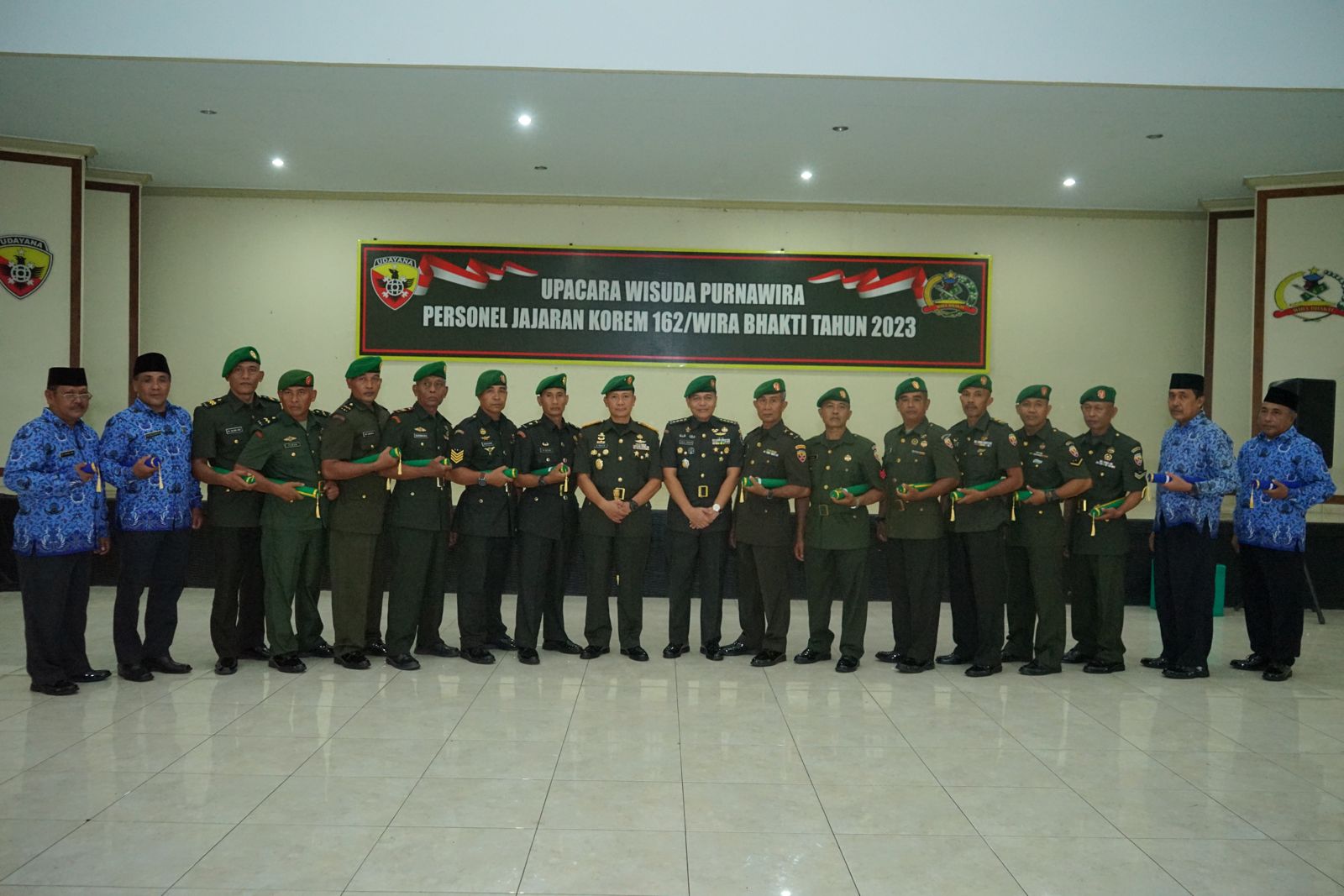 Prajurit dan PNS jajaran korem 162/Wira Bhakti yang akan melaksanakan wisuda purnawiran sebanyak 20 orang, diantaranya perwira sebanyak 3 orang dan gabungan bintara, tamtama serta PNS sejumlah 17 orang dimana untuk perwira akan diwakilkan oleh Mayor Inf., (Purn) Kadim Alfian, bintara diwakilkan oleh Serma (Purn) Hasan, dan tamtama diwakilkan oleh Kopka (Purn) Khoja Serta PNS diwakilkan oleh (Wredatama) Muhali,”Ungkap Orang NomerĀ Satu di Korem 162/WB.