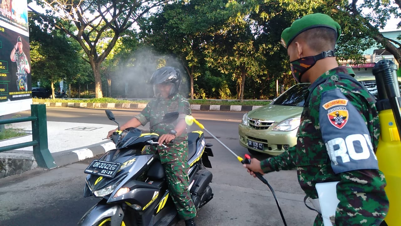 Mataram – Sebagai salah satu upaya meminimalisasi penyebaran virus corona atau Covid -19 di lingkuang tempat kerja, Komando Resort Militer 162/WB melaksanakan penyemprotan kepada seluruh personel dipintu masuk Makorem 162/WB jalan Lingkar Selatan Kota Mataram.