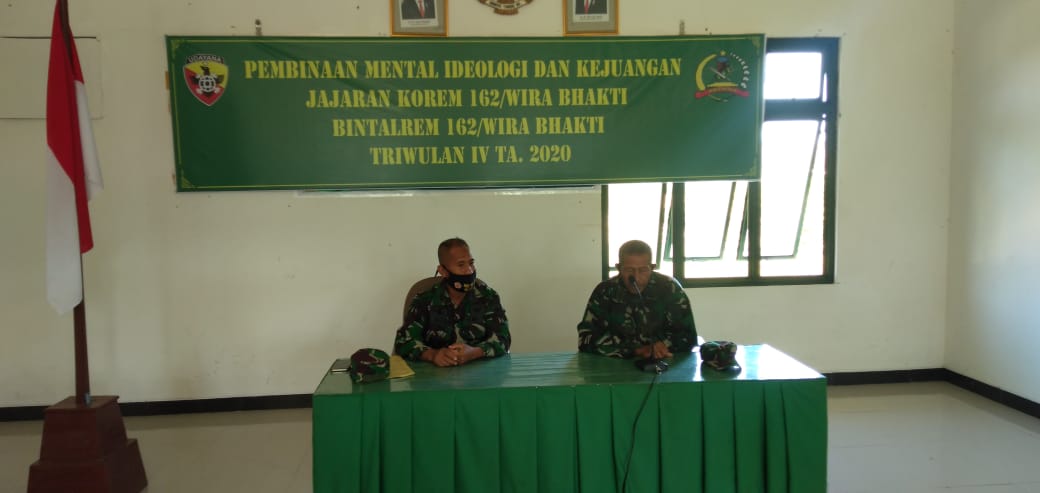 Sumbawa Barat – Korem 162/Wira Bhakti melaksanakan kegiatan pembinaan mental Triwulan IV TA. 2020 bertema “Pembinaan Mental Ideologi dan Kejuangan Jajaran Korem 162/Wira Bhakti” bertempat di Aula Makodim 1628/Sumbawa Barat, Kamis (22/10).