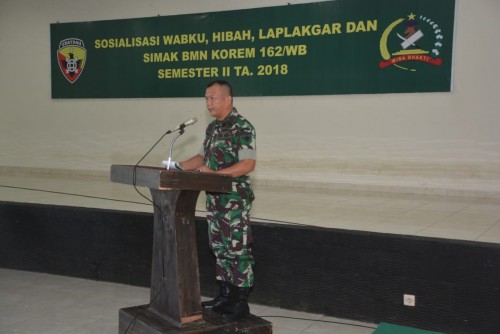 Mataram – Korem 162/WB menggelar sosialisasi Perwabku, Hibah, Laplakgar dan Simak BMN Korem 162/WB Semester II Tahun 2018 yang dibukan Kepala Staf Korem 162/WB Letnan Kolonel Inf Endarwan Yansori di Aula Sudirman Korem 162/WB, Rabu (28/11).