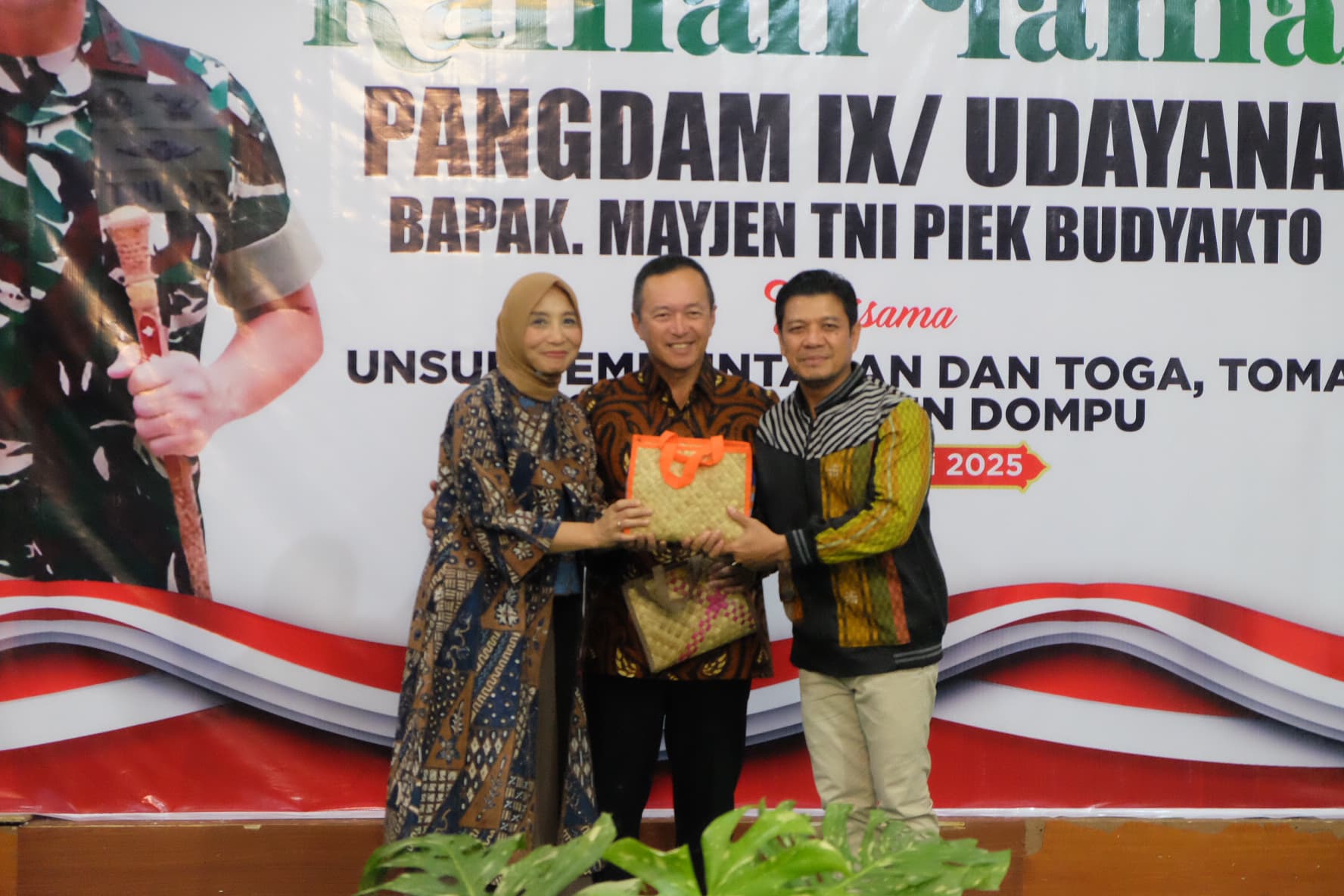 DOMPU, NTB – Pangdam IX/Udayana, Mayjen TNI Piek Budyakto, S.H., M.H., bersama Ketua Persit Kartika Chandra Kirana Daerah IX/Udayana, Ny. Indah Widhianti, didampingi Danrem 162/Wira Bhakti, Brigjen TNI Moch. Sjasul Arief, S.Sos., dan rombongan melaksanakan kunjungan kerja di wilayah Kabupaten Dompu, Senin (2/6/2025). Kunjungan ini bertujuan mempererat silaturahmi serta memperkuat sinergi antara TNI AD dengan unsur Forkopimda, tokoh masyarakat, dan tokoh agama setempat.